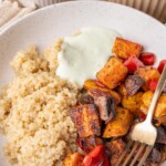 This Sweet Potato Quinoa Bowl is hearty, colorful, and weeknight-easy: roasted sweet potatoes, mushrooms, and red bell pepper tossed with warm spices, fluffy quinoa, and a cool lemon-yogurt-avocado sauce. Simple ingredients, great texture, and lots of flavor.